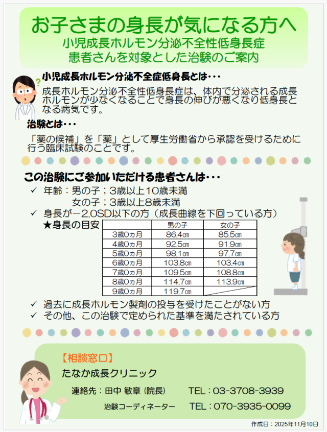 たなか成長クリニックは、低身長を中心とした小児内分泌疾患を扱う専門性の高いクリニックです。