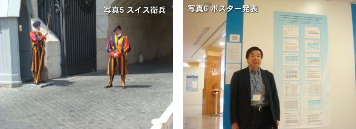 私はその後シンポジウム会場に戻って聴講と、「日本の成長ホルモン分泌不全性低身長症における成長ホルモン治療の短期効果と長期効果」および「SGA低身長症における成長ホルモン治療の長期効果」についてのポスター発表を行った(写真6)。その日のシンポジウムが終わってまたローマ市内に戻り、夜は「濱清」という日本料理屋に行って食べた。イタリア料理も美味しかったが、やはり日本料理が最高だ。亡き藤枝先生の日本料理好きを思い出しつつ美味しい料理に舌鼓を売った。