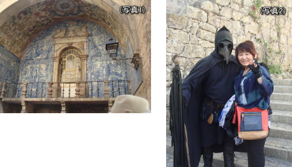 ポルトガル最初の観光は、リスボンから車で北へ約一時間のオビドス。そこで現地ガイドのロザリオさんと合流した。イタリアでもそうだったが、日本人は正式のガイドにはなれないので、観光する時は、必ず現地ガイドが付くとのこと。1288年にディニス王からイザベル王妃に贈られ、以後1833年まで代々王妃に受け継がれた街で、その美しさで「谷間の真珠」と呼ばれている。城壁に囲まれた街で、入口にポルトガルの伝統装飾タイルのアズレージョで飾られた(写真1)城門ポルタ・ダ・ヴィラからはいると、中は土産物屋が並び、ブーゲンビレアなどの美しい花が咲き乱れる石畳が続いていた。中世のコレラの医師の感染防御服を着た人がいて、スターウオーズのダース・ベーダーのようだった(写真2)。コルクのお土産屋でコルクのネクタイを買い、サンタ・マリア教会の中を見て歩いた。石焼き竃で丁度パンを焼いているのを見られたのは、興味深かった(写真3)。城壁からの眺めも美しかったが、城壁に手すりがなく、無理に歩いて落下する人が毎年何人かいるとのこと。