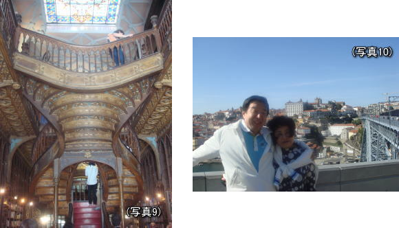 その後、一路ポルトへ。2時頃着いて、食べたタコライスは、なかなかのものだった。サン・フランシスコ教会は、金泥を塗った木彫りの彫刻で埋め尽くされており、モロッコでのフランシスコ会の5人の殉教や長崎西坂の丘での26人のキリスト教徒の殉教(秀吉のキリシタン禁止令により、6人の外国人宣教師と20人の日本人が1597年に磔になった事件)の場面などがあり、なかなかの迫力だった。ハリーポッターを書いたローリングが通い、世界で美しい三大書店の一つとして有名なリヴラリア・レリョへ行った。中は曲線の美しい階段や、天井のステンドグラスなど一見の価値があった(写真9)。入るのに3ユーロ取られるが、本を買うと3ユーロ値引きしてくれるので、書店の案内書を買った。ドンルイス一世橋のたもとまで行って見た風景は、るるぶのポルトガル案内の表紙を飾っていた世界遺産の旧市街のレンガ色の屋根の家々であった(写真10)。ちなみに地球の歩き方の表紙はナザレの街だった。ドロウ川縁に、ポートワインで有名なワインセラーSandemanがあり、見学ツアー、試飲、購入という一連の流れに身を任せた(写真11)。